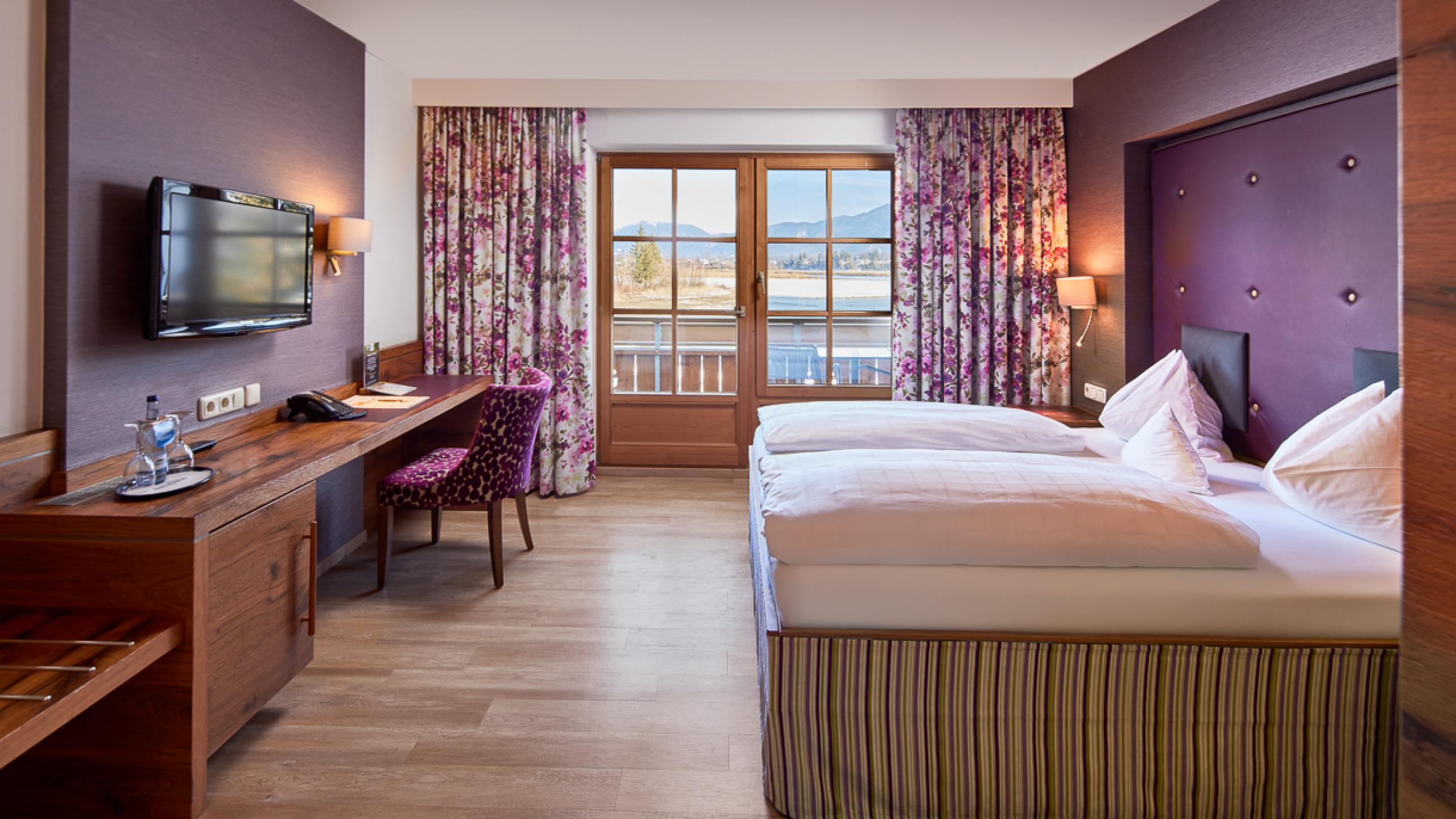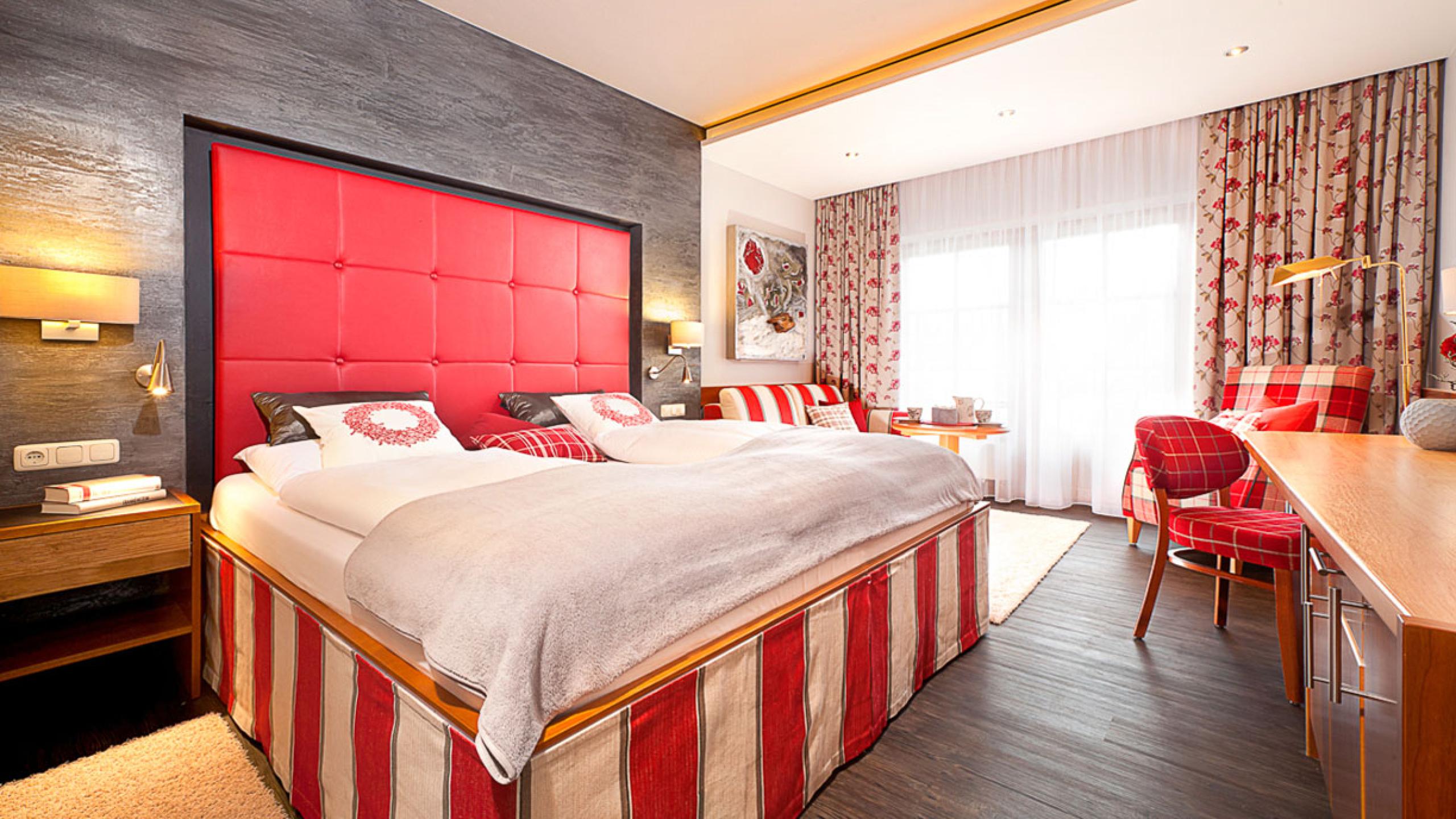In unseren Doppelzimmern Superior (Bett 1,80 x 2,00 m) finden Sie neben der Grundausstattung eine Badetasche mit Saunatüchern, Bademäntel für den Wellnessbereich sowie einen Rucksack für Wanderungen. Für Großgewachsene bieten wir auf Anfrage überlange Betten.